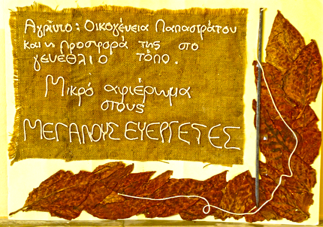 Φωτο: Ο τίτλος του Προγράμματος κεντημένος σε λινάτσα που τύλιγαν τα δέματα του καπνού. Συμβολικά μερικά καπνόφυλλα και η βελόνα ραψίματος στην κορυφή…