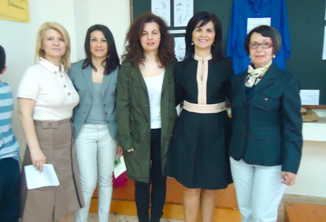 Φωτο: Οι υπεύθυνες του Πολιτιστικού Προγράμματος: Β. Σκεπετάρη, Ε. Κατσαντώνη, Α. Δαλιάνη, Μ. Αγγέλη με την Καθηγήτρια Πανεπιστημίου Πατρών Δ. Μονιούδη-Γαβαλά στην αίθουσα εκδηλώσεων του 2ου Γυμνασίου Αγρινίου(13/5/2014)
